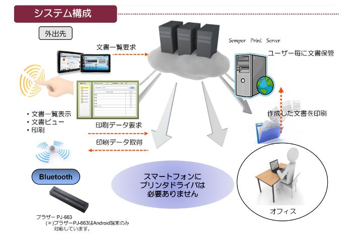 印刷データをSemperPrintServerで管理し、Android端末にインストールしたSemperPrintCrientアプリケーションからアクセスする事で、印刷を行う事を可能とするアプリケーションです。